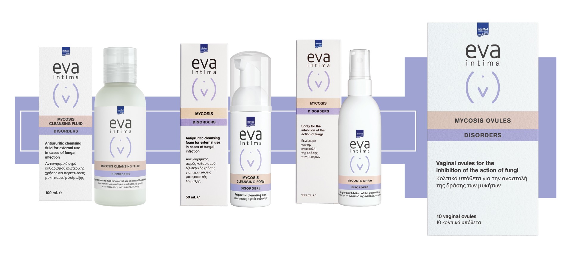 Mε αντίστοιχη δράση, τα σκευάσματα Eva Intima Mycosis cleanser foam, cleansing fluid & intimate spray, ενισχύουν την πιο ολοκληρωμένη φροντίδα της ευαίσθητης περιοχής και άλλων δερματικών περιοχών, όταν υπάρχει μυκητιασική λοίμωξη.