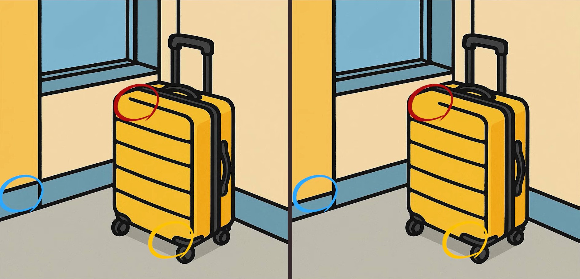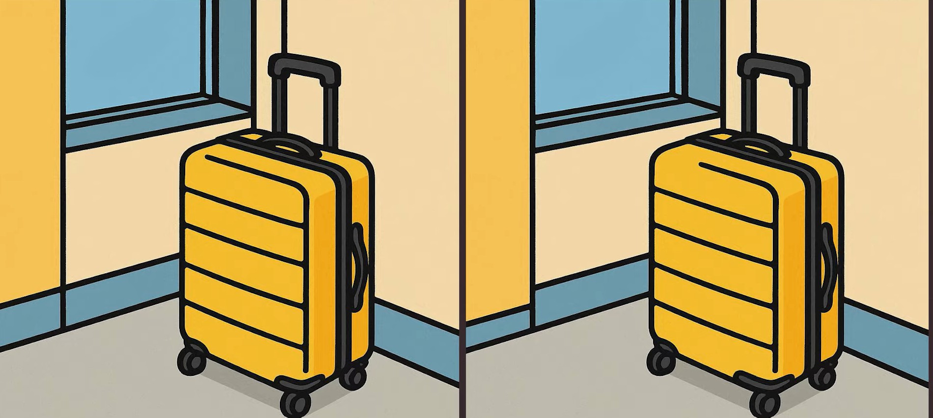Παρατηρήστε προσεκτικά αυτές τις δύο εικόνες με τη βαλίτσα δίπλα στο παράθυρο. Μπορεί να φαίνονται ίδιες, αλλά αν προσέξετε καλύτερα, θα δείτε ότι υπάρχουν τρεις διαφορές κρυμμένες μέσα στην εικόνα.