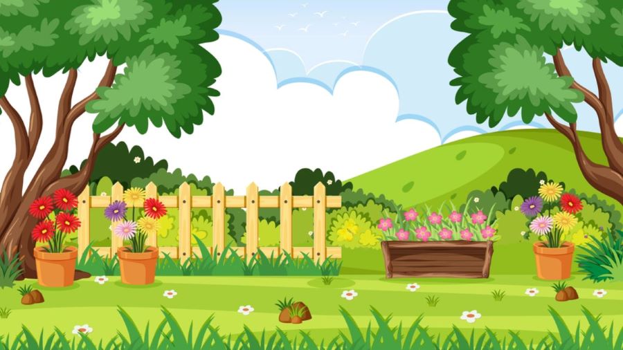Στην παραπάνω εικόνα, μπορείτε να δείτε μια φωτεινή και χαρούμενη εικονογράφηση ενός ηλιόλουστου κήπου σε μια όμορφη ημέρα. Υπάρχουν δύο μεγάλα, φυλλώδη δέντρα στα πλάγια και πράσινο γρασίδι με πολλά πολύχρωμα λουλούδια σε γλάστρες. Στο βάθος, υπάρχει ένας μικρός ξύλινος φράχτης, λοφίσκοι που απλώνονται και ένας μπλε ουρανός με αφράτα λευκά σύννεφα και πουλιά.